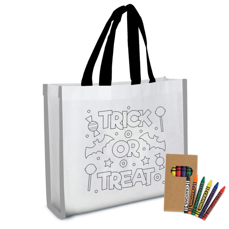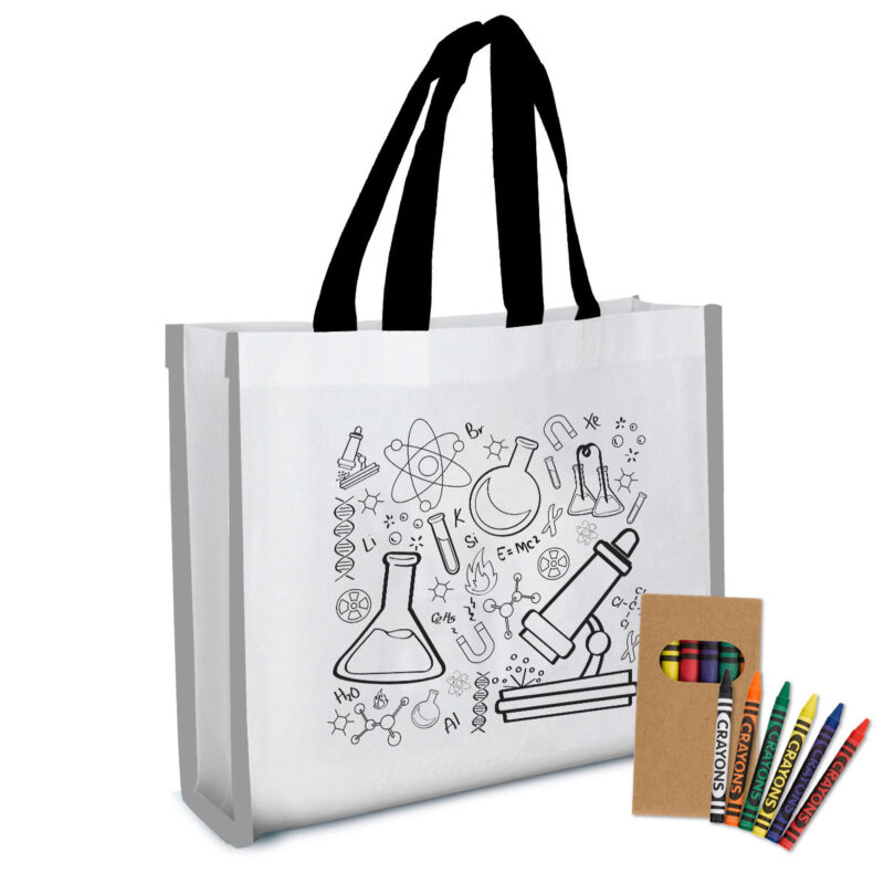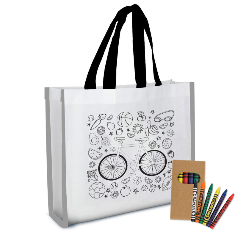 80 GSM non-woven polypropylene tote with stitched seams, side and bottom gussets, 15 3/4″ reinforced sewn handles and patented reflective piping. Set of 6 crayons included. Bag containing 20% post-industrial recycled content.
