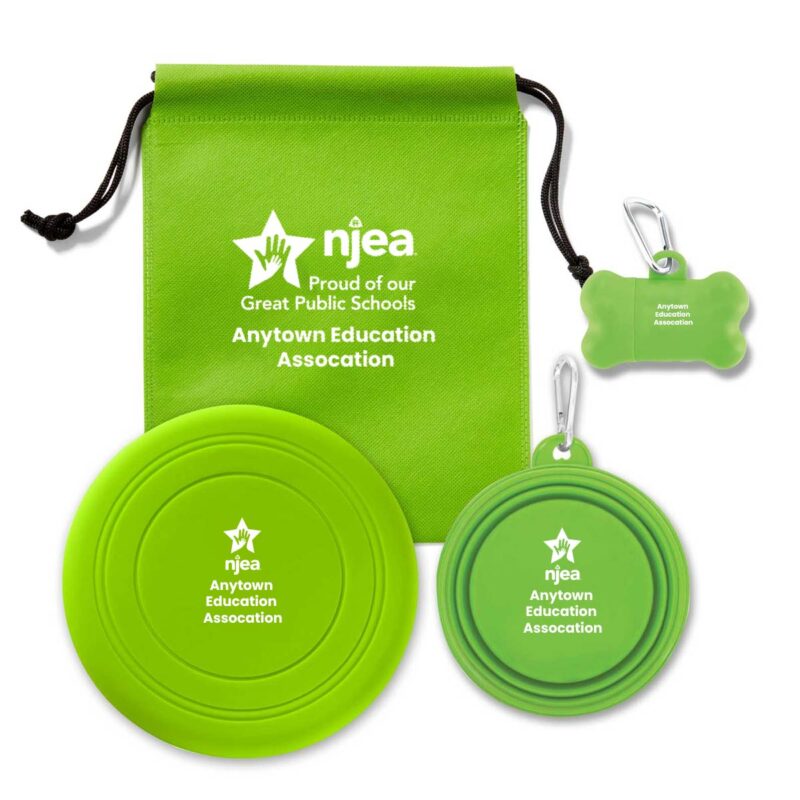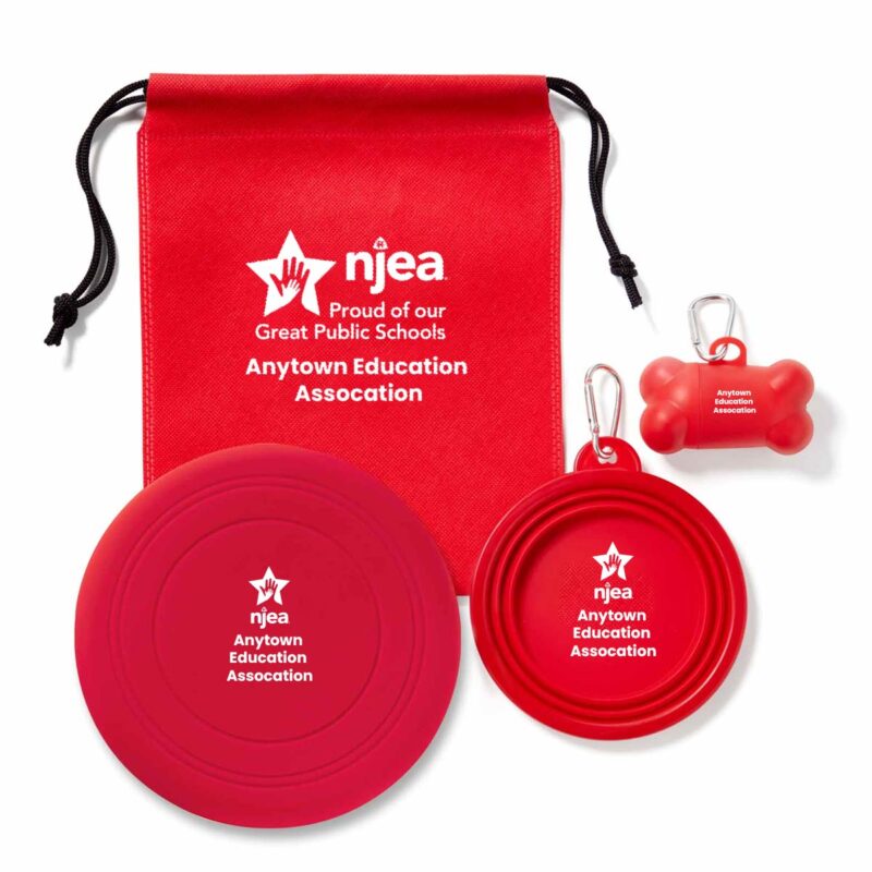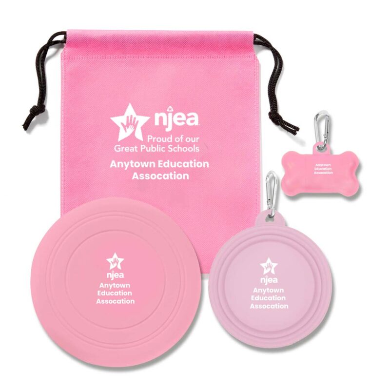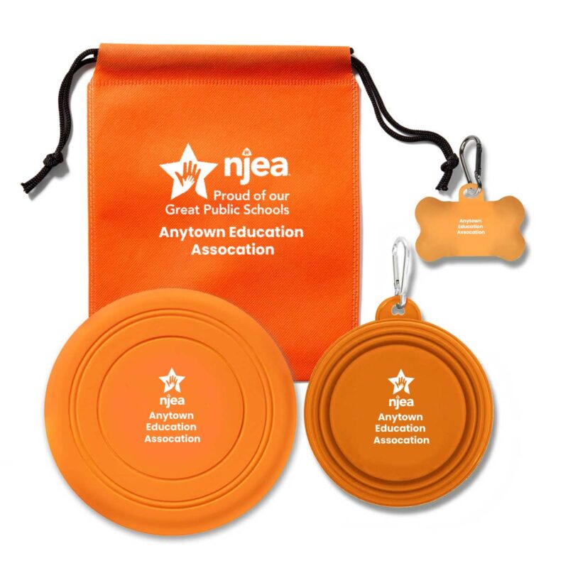 This Pet Play Kit includes one collapsible pet bowl, one dog bone bag dispenser, and one silicone flyer, which all come packaged inside a drawstring pouch. Your price includes a one color imprint on each item.